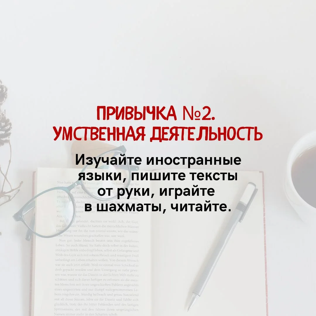 Тогда обратите внимание на четыре привычки, важных для здоровья мозга и сохранения прекрасной памяти, – они на наших карточках.